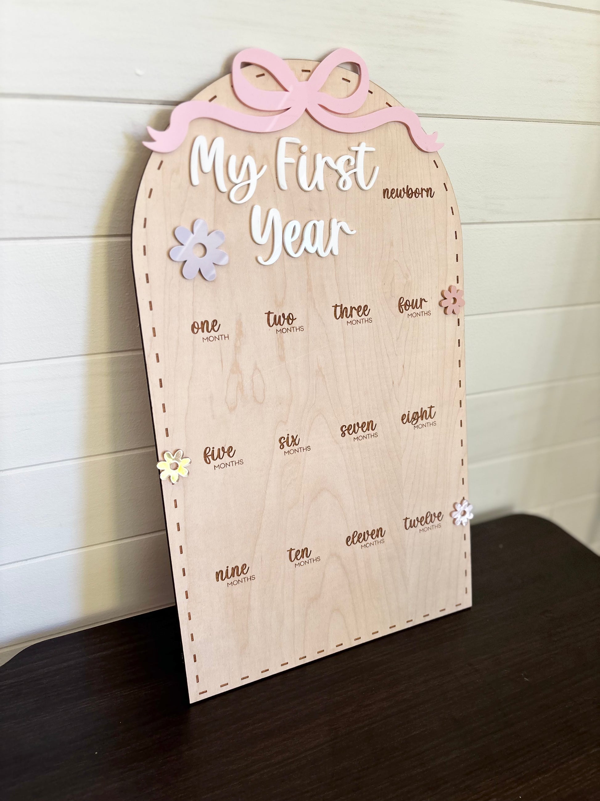 🎀 Celebrate your baby’s first year in style! This charming wooden photo board features a delicate bow and pastel flowers, with spaces for monthly photos from newborn ➝ twelve months.