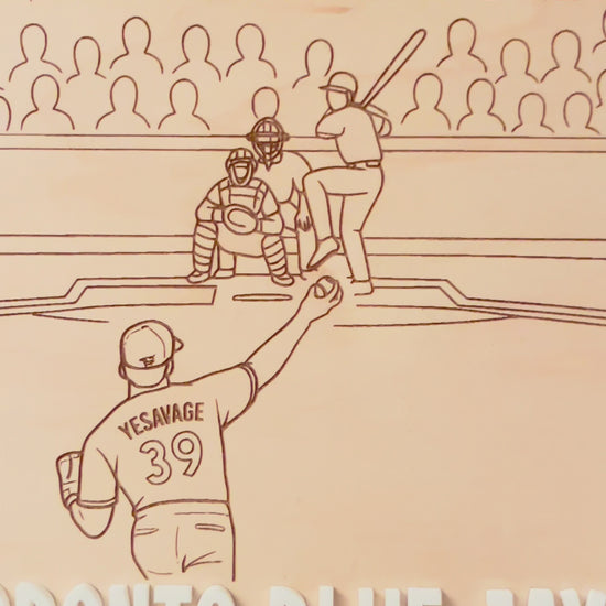 Each piece is laser-engraved and framed in a glossy blue border, showing Yesavage on the mound with the crowd behind him. A perfect keepsake for any Toronto Blue Jays fan!