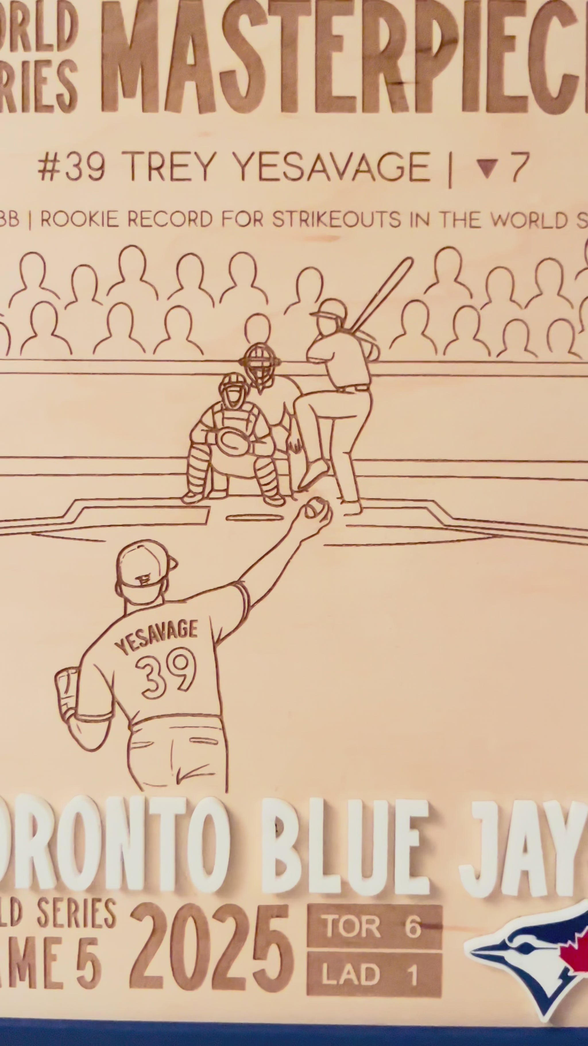 This engraved wood plaque captures Trey Yesavage’s incredible Game 5 performance — 12 strikeouts, 0 walks, and a rookie record in the World Series!