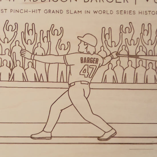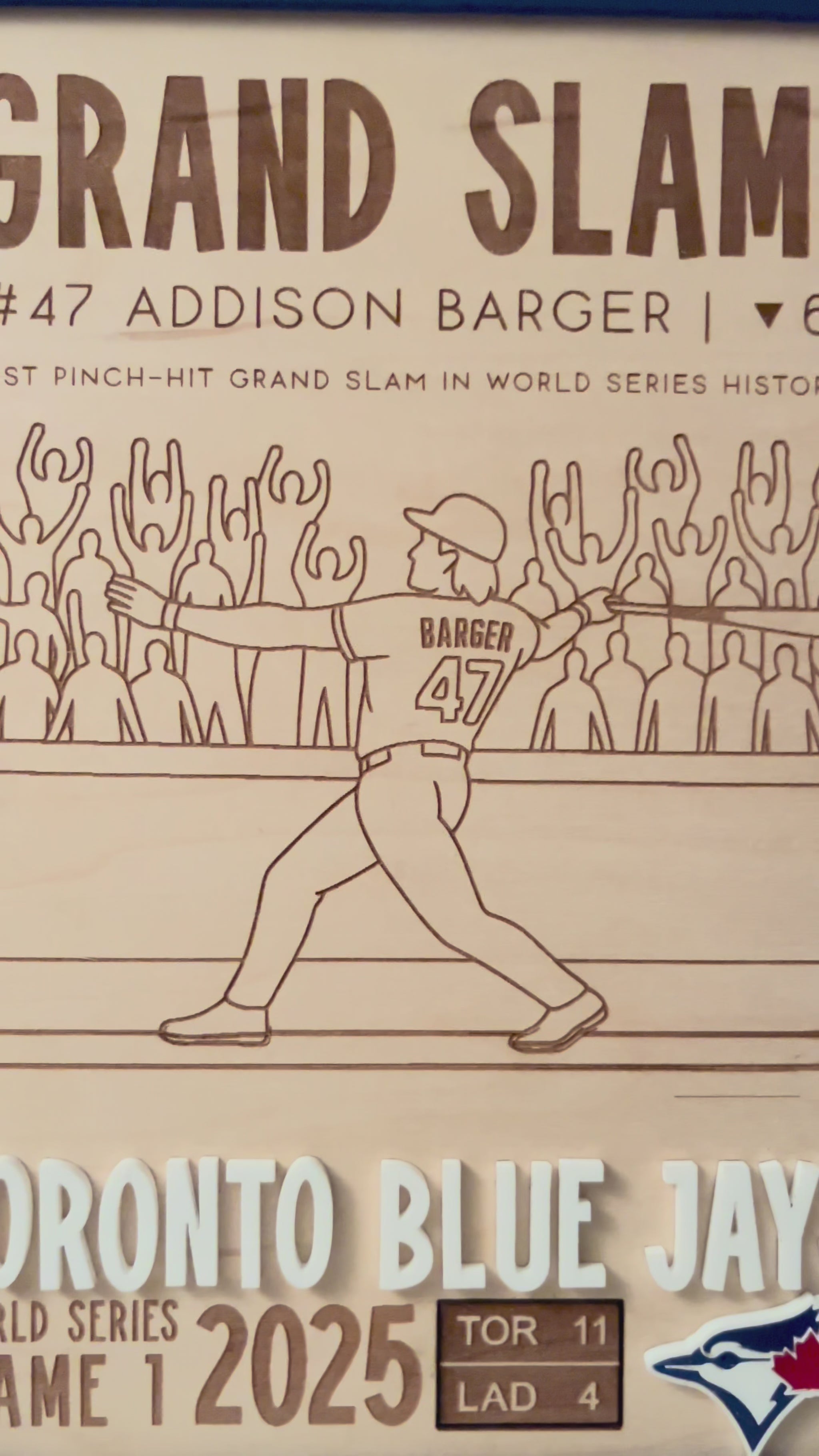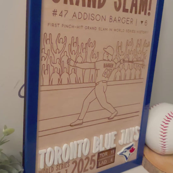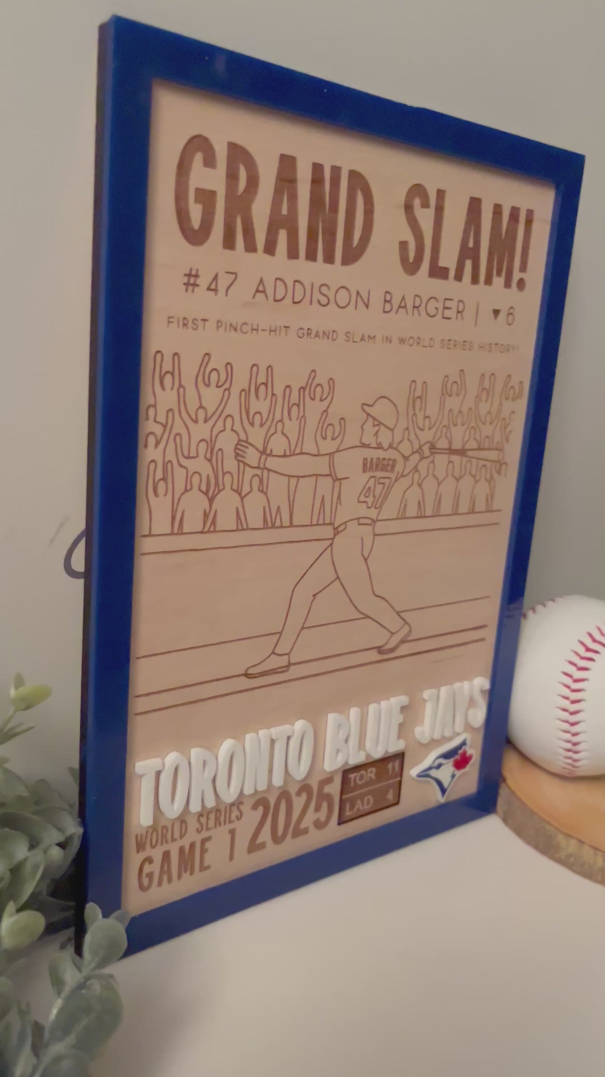 Bring the electric energy of the 2025 World Series Game 1! This engraved wood plaque celebrates the Toronto Blue Jays’ 2025 World Series Game 1 featuring Addison Barger and his Grand Slam! 💪